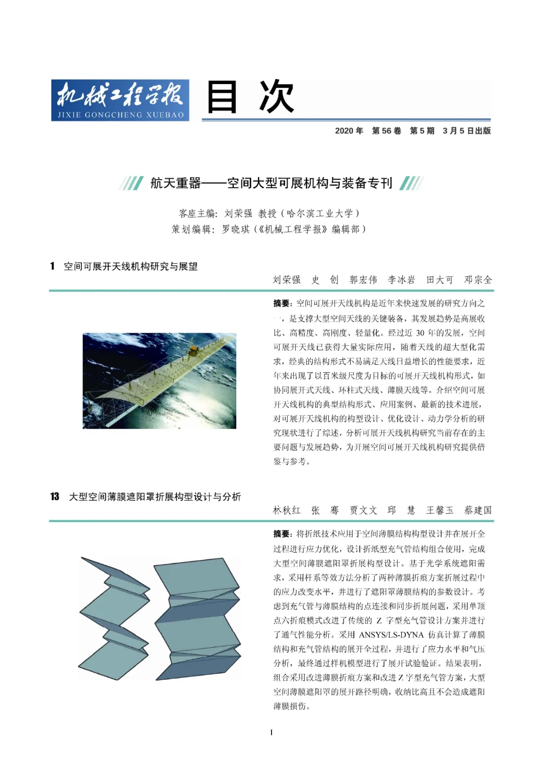 近年来,我国在空间可展机构领域的研究与应用也取得了长足进展。为了全面报道该领域的研究进展情况,展示阶段性成果,《机械工程学报》特邀哈尔滨工业大学刘荣强教授担任客座主编,于2020年第5期出版了航天重器——空间大型可展机构与装备专刊。本专题围绕空间可展机构设计理论与方法、空间可展机构新材料、新原理与新方法、地面试验验证与测试技术以及空间环境适应性与可靠性技术等内容进行了全方位综合报道。